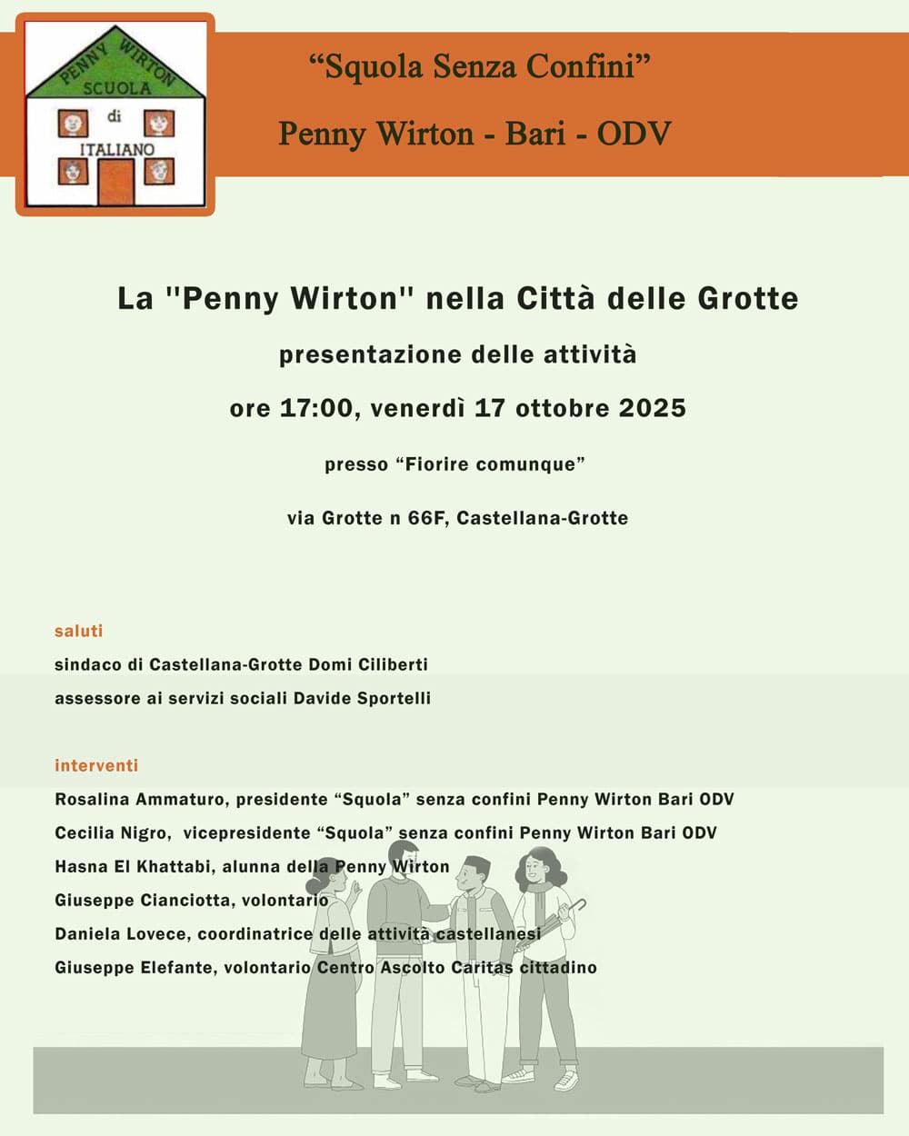 ქალაქ კასტელანა გროტეს ადგილობრივი საინფორამციო საგენტოს www.vivicastellanagrotte.it ინფორმაციით, 17 ოქტომბერს, 17:00 საათზე, კასტელანა გროტეში (მისამართი: Via Grotte n. 66F, ოფისი „Fiorire Comunque“) გაიმართება სკოლის „Penny Wirton“ ადგილობრივი ფილიალის ოფიციალური პრეზენტაცია.