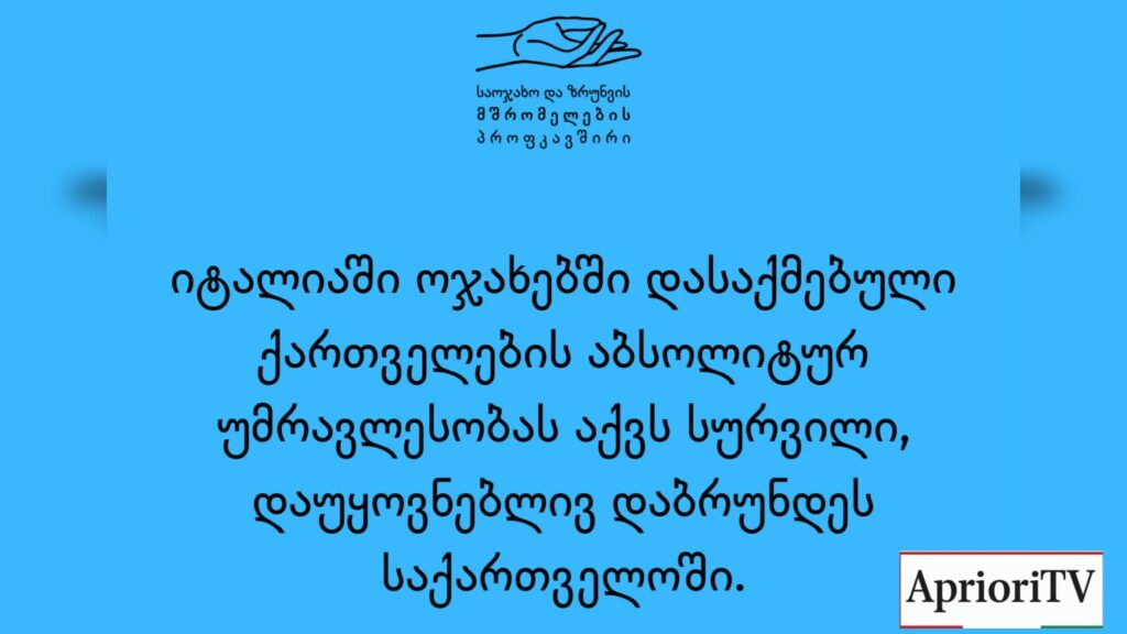 9 ოქტომბერს ძიძების და საოჯახო მშრომელების ასოციაციისა და საოჯახო და ზრუნვის მშრომელთა პროფკავშირის ინიციატივით, დიასპორული მედია AprioriTV-სთან თანამშრომლობით, გაიმართა ონლაინ შეხვედრა იტალიაში მცხოვრებ ქართველ ემიგრანტებთან. მიზანი იყო მათი საჭიროებებისა და საქართველოში დაბრუნების სურვილის შესწავლა.